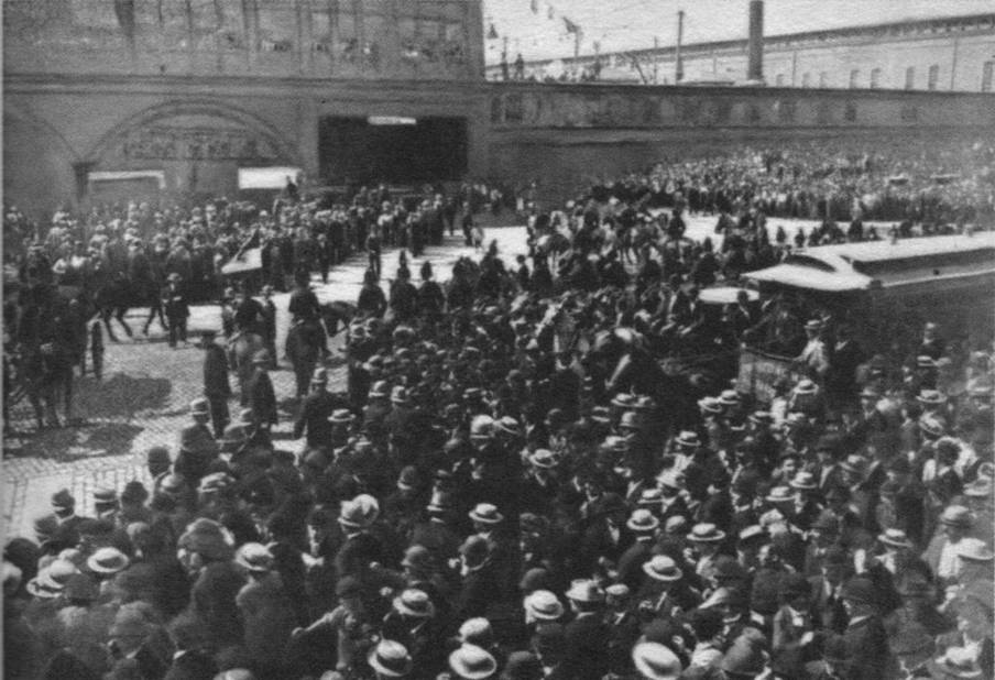 美国欢迎人群在纽约码头外等待李鸿章的出现。