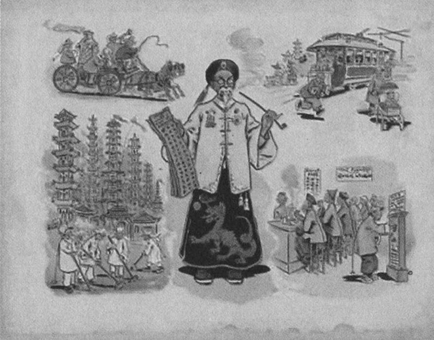 穿黄马褂的李鸿章漫画。美国人天性比较乐观,也比较主观。这个画家看来既没见过李,也不了解中国社区。画中李鸿章居然穿着龙袍,那是要杀头的!李抽烟,但抽的是水烟。后面的中国社区也不典型,在美华人不去酒吧,即便是高级茶馆,也没有这种高凳子。宝塔林立,好像成了炼油厂。