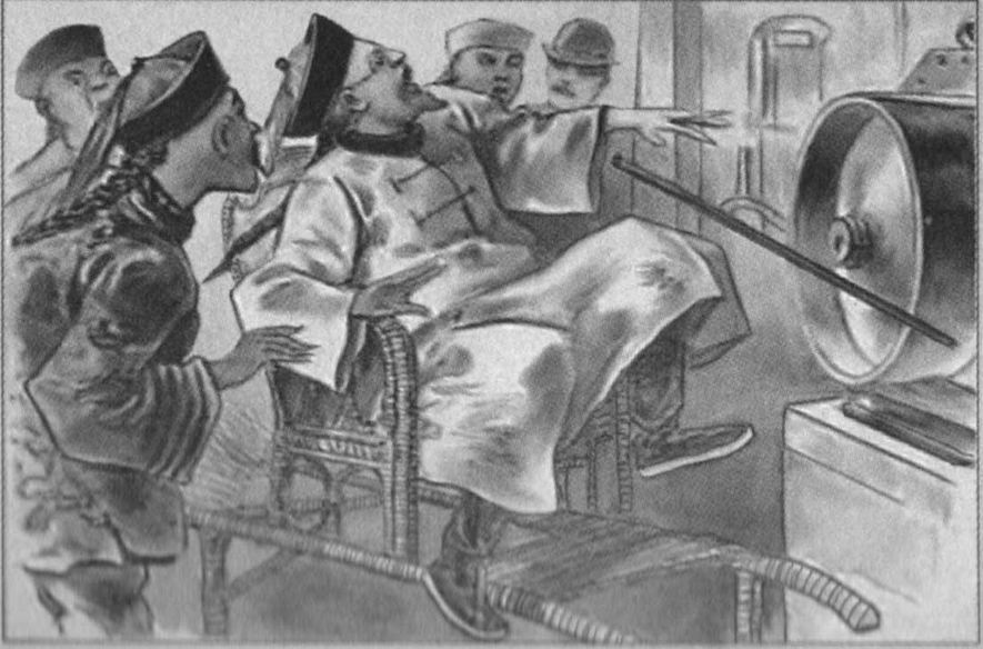 又一幅漫画,登在1896年左右出版的美国《国家警察宪报》。画中李鸿章在尼亚加拉大瀑布旁,见到一台发动机轰然启动的一霎那,惊得手杖都掉了。该报本属于“法制刊物”类,也来凑凑“李鸿章热”,可见李鸿章当年的明星效应。