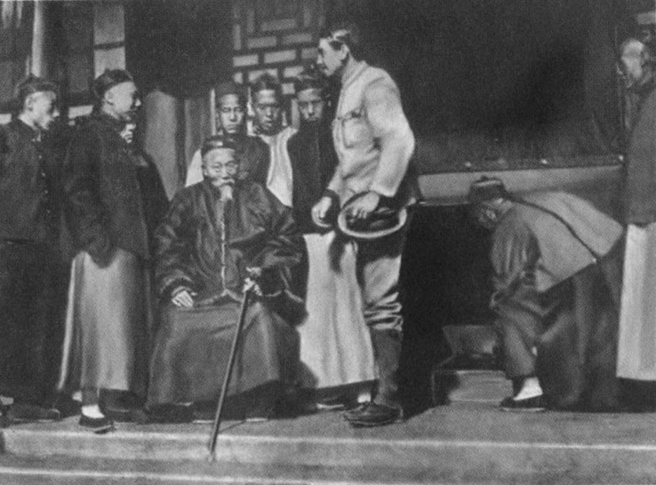 贤良寺西三跨院里的李鸿章。这是一张不可多得的照片。这个洋人可能是来推销军火什么的“洋行经理”。