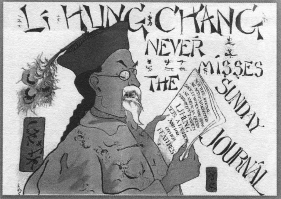 李鸿章推销《星期天新闻报》。图中李在阅读英文报纸,其实他一个英文字也不识。旁边的文字说明是:李鸿章从来不会错过《星期天新闻报》。